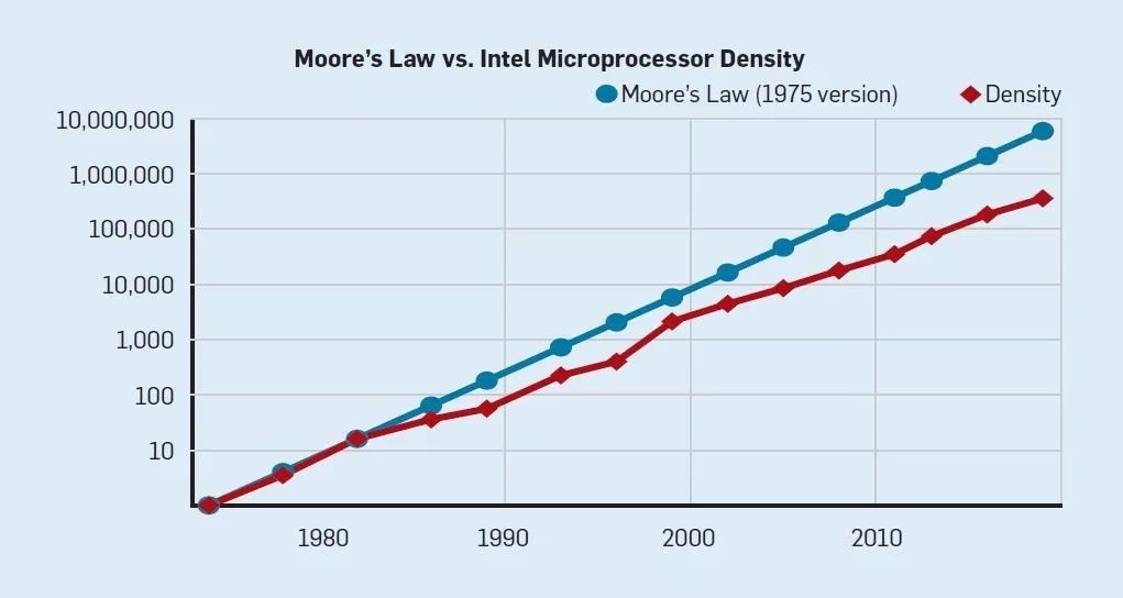 图 | 现实情况与摩尔定律的预测差距越来越大
