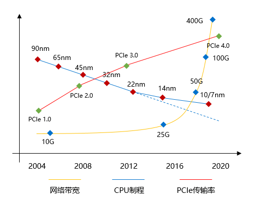 图 2 网络带宽与服务器硬件演变趋势