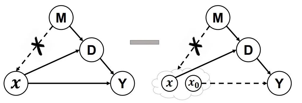 因为混淆因子和中介的存在,我们最终期望得到的X对Y的effect其实并不是原始效应(原始logits),而是下图这样的去混杂后的直接效应。其中De-confound training可以在训练中控制M对X的影响,而counterfactual inference的减法,通过类似设置安慰剂对照组的思想,去除了间接效应。