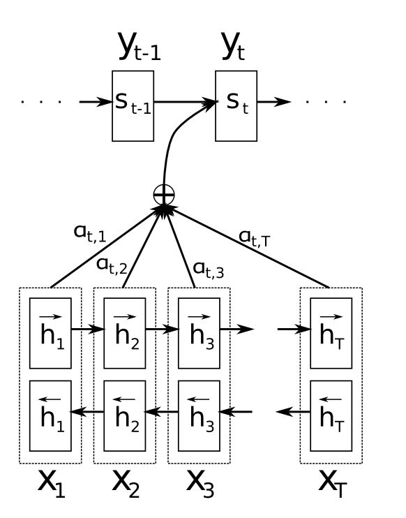 从而得到背景向量 (context),后面就没什么变化了,y_t 基于 s_{t-1}, y_{t-1} 和 context 来生成。