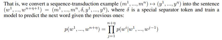 就是说本来 Transformer 中的 decoder 是要接收 encoder 那边对输入 (m) 处理后得到的信息,然后得到最终输出(y),而且在得到后面的 y 的时候,要考虑前面已经生成的 y,因此在去掉 encoder 之后,decoder 在考虑 y 的同时也得考虑 m 的信息,所以公司既然裁员了,那么 decoder 的活就得多一些,它的输入就是 m 和 y 的结合体了,同时中间还有 \ gamma 来分隔开输入输出(黑心老板无疑了),当然这样做的时候,给的工资也是更高的(输入序列长度从 512 变成了 1024)。
