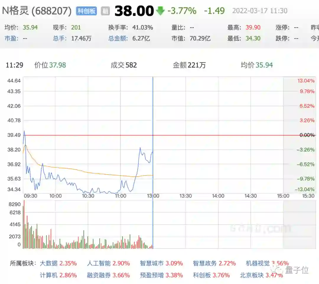 值得一提的是,今日一开盘即破发,下跌近4%。截止十一点半,股价为38元每股,市值约70亿元。
