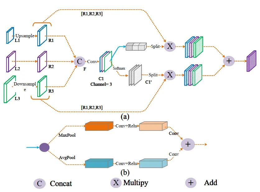 具体来说,假设输入的大小可以表示为(bs, C, H, W),可以通过卷积级联和Softmax操作得到(bs, 3, H, W)的空间自适应权值。3个通道一一对应3个输入,通过计算加权和,可以将上下文信息聚合到输出。