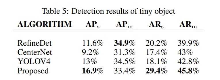 本文算法比YOLOV4算法提高3.9% (16.9%vs.13%),在比较算法中最高。与RefineDet相比在上高9.2%(29.4% vs. 20.2%),而在上低1.5%。