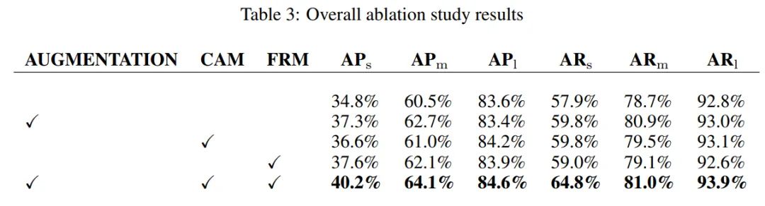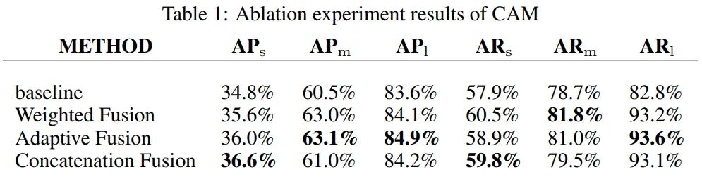 作者通过消融实验验证了每种融合方法的有效性, 结果如下表1所示。 和 被定义为小、中、大目标的精度。其中 和 分别表示对小、中、大目标的召回率。