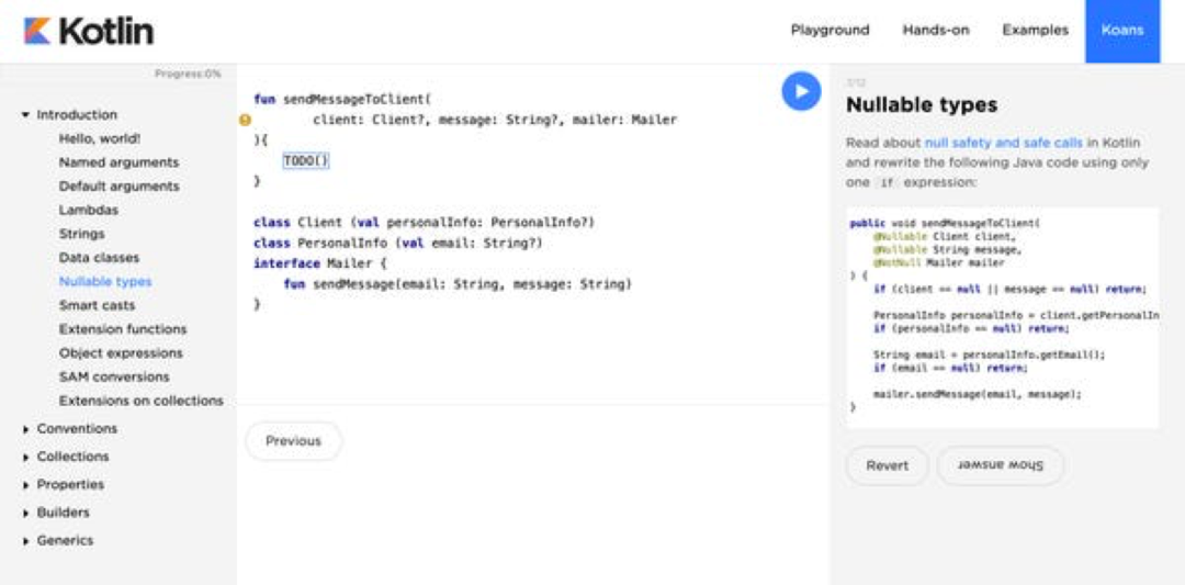 KotlinLang.org为具有编码知识的人提供了一个交互式教程: