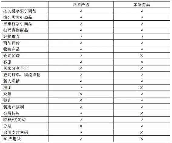 基本的搜索商品、收藏商品、加购物车、购买商品、评价以及平台的好物推荐,两者都具备,网易严选有的一些优势功能包括查询足迹,会员特权、拼团包括平台客服等功能,米家有品也有包括众筹,签到,和分期等功能是严选不具备的。