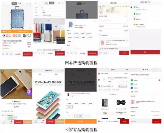 网易严选:整体的购物流程上没有特别创新的地方,商品详情页可浏览商品,查看详情,收藏,加购物车,也可以通过直接购买跳到购买页,然后确认完信息后跳转选择支付平台,支付完就可以在待收货中看到产品了。