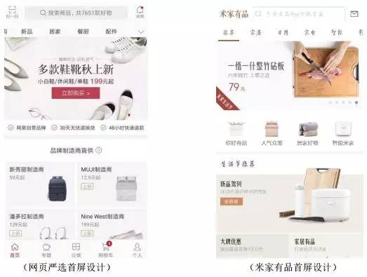 两者首屏中的内容都相对较少并且比较整洁(因使用米家有品正处于其活动期间,所以首屏截选了网上一张旧版本的首页图)。