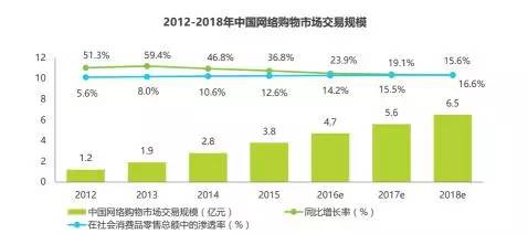随着电子商务的发展,网络购物市场的规模呈现逐步上升的状态,根据艾瑞网的数据,中国网络购物市场交易规模,2017年预计同比增长19.1%,在社会消费品零售总额中的渗透率约占15.5%。