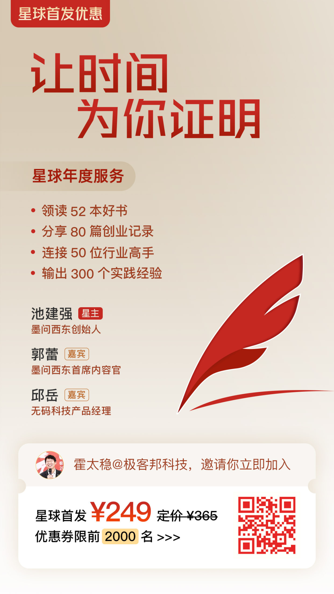 还记得 2021 年 10 月,极客时间四周年,我们讨论起产品的未来。Selina(极客邦科技联合创始人兼 COO)分享了一个案例:有些公司为了冲营收,干了很多伤害用户体验的事,社区有很多差评。我们唏嘘着回应说,无论如何,一定要做一家令人尊敬的公司。