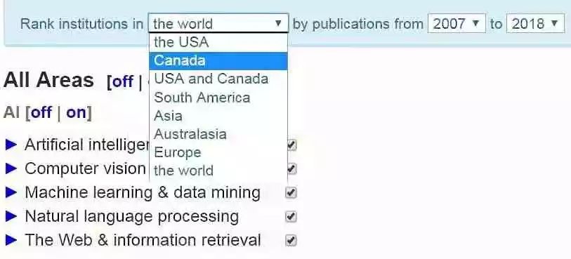 排名的区域分为8大类,其中包括:美国、加拿大、美国和加拿大、北美、亚洲、澳大利亚、欧洲、全球。再根据近十年多来(2007-2018)的论文发表对各大学实力进行了排名,数据截止日期为 2018年2月19日