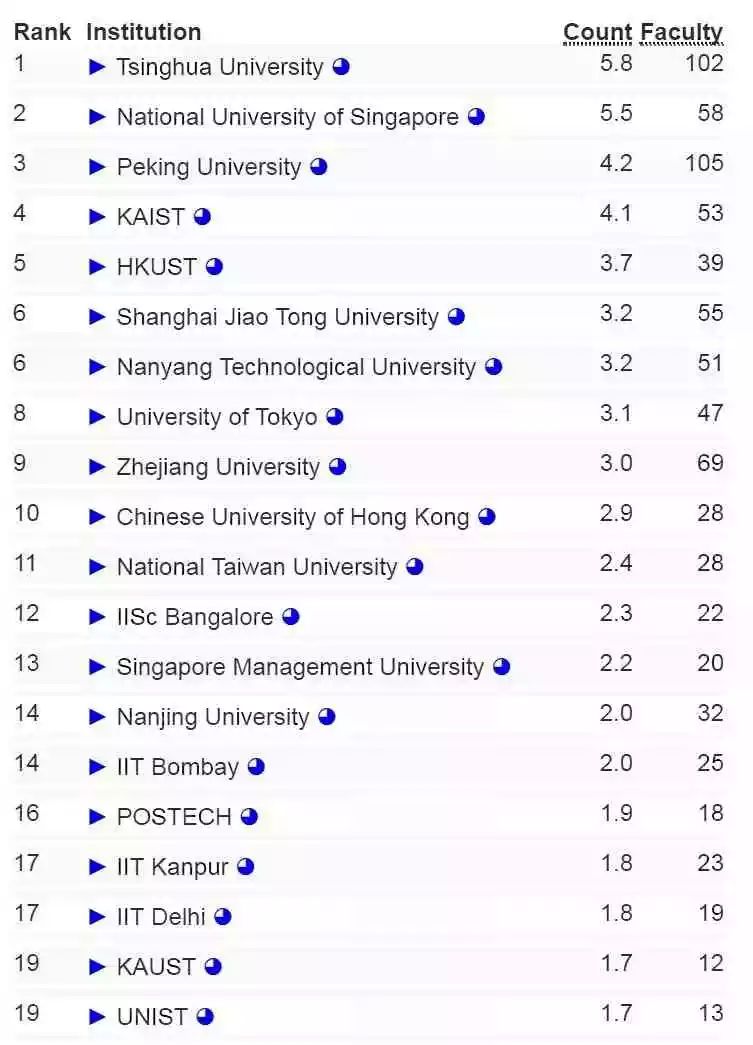 亚洲地区的高校排名中,前三名分别是:清华大学、新加坡国立大学、北京大学。第四到第十名分别为:韩国科学技术院、香港科技大学、上海交通大学、南洋理工大学、东京大学、CUHK。