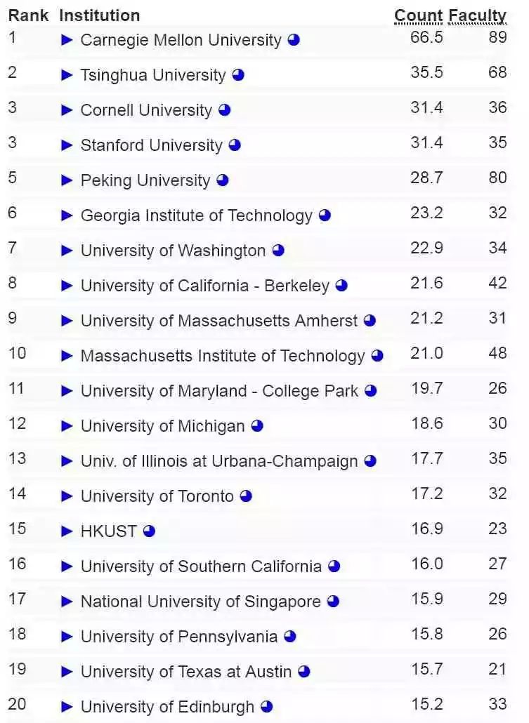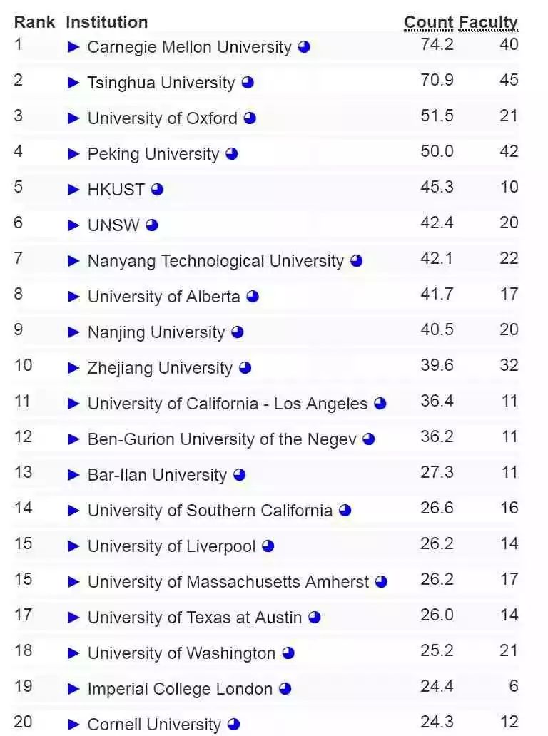 如果只考虑 AI 部分的排名,排名第一的是卡内基梅隆大学(CMU),清华大学排名第二,康奈尔大学和斯坦福大学并列第3;第5到第10名分别为:北京大学、 佐治亚理工学院、华盛顿大学、加州大学伯克利分校、马萨诸塞大学安姆斯特分校、麻省理工学院