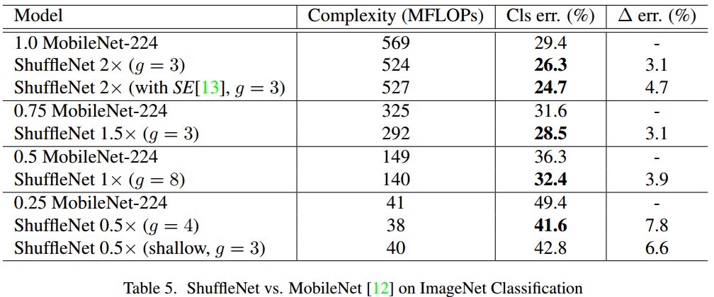 至于实验比较,并没有给出模型参数量的大小比较,而是采用了 Complexity (MFLOPs) 指标,在相同的 Complexity (MFLOPs) 下,比较 ShuffleNet 和各个网络,还专门和 MobileNet 进行对比,由于 ShuffleNet 相较于 MobileNet 少了 1*1 卷积层,所以效率大大提高了嘛,贴个对比图随意感受一下好了