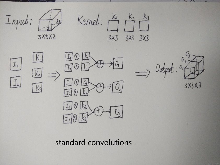 Standard 过程如下图,X 表示卷积,+表示对应像素点相加,可以看到对于 O1 来说,其与输入的每一个 feature map 都「发生关系」,包含输入的各个 feature map 的信息。