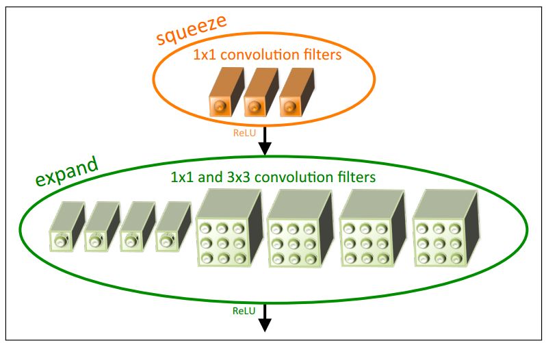 1. 采用不同于传统的卷积方式,提出 fire module;fire module 包含两部分:squeeze 层+expand 层