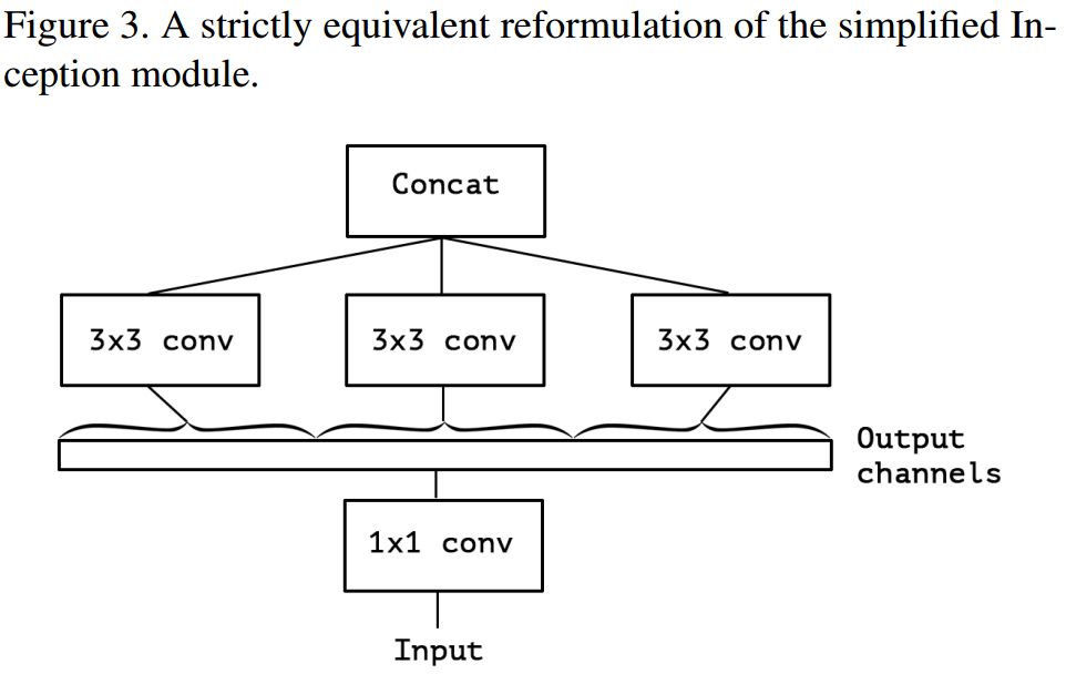假设出一个简化版 inception module 之后,再进一步假设,把第一部分的 3 个 1*1 卷积核统一起来,变成一个 1*1 的,后面的 3 个 3*3 的分别「负责」一部分通道,如图 3 所示; 最后提出「extreme」version of an Inception,module Xception 登场,,先用 1*1 卷积核对各通道之间(cross-channel)进行卷积,如图 4 所示,
