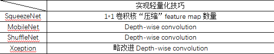 在此列出表格,对比四种网络是如何达到网络轻量化的。