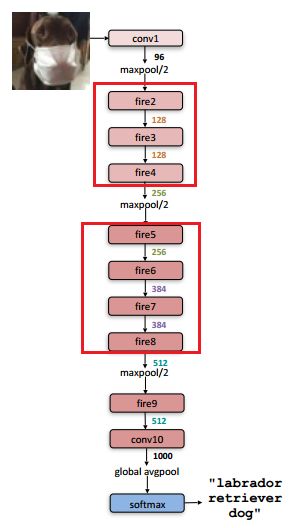 网络结构设计思想,同样与 VGG 的类似,堆叠的使用卷积操作,只不过这里堆叠的使用本文提出的 Fire module(图中用红框部分)