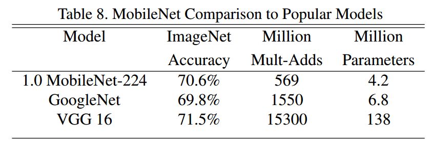 1.0 MobileNet-224 与 GoogLeNet 及 VGG-16 的对比: