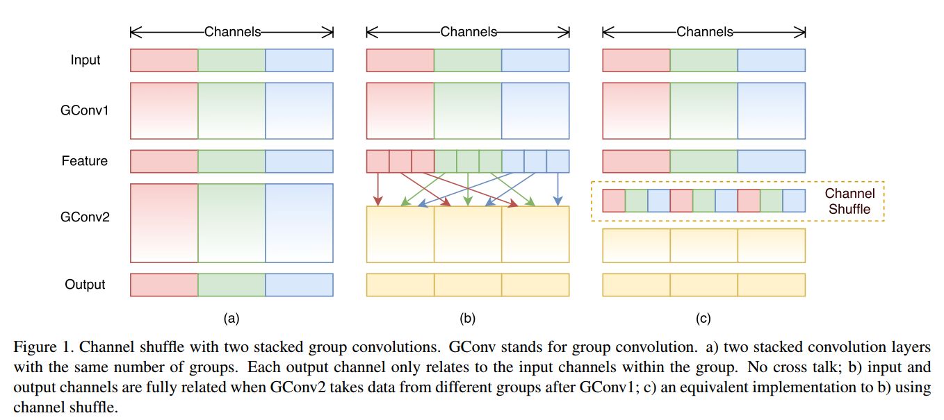 其中 group convolutiosn 非原创,而 channel shuffle 是原创。channel shuffle 因 group convolution 而起,正如论文中 3.1 标题: . Channel Shuffle for Group Convolution;