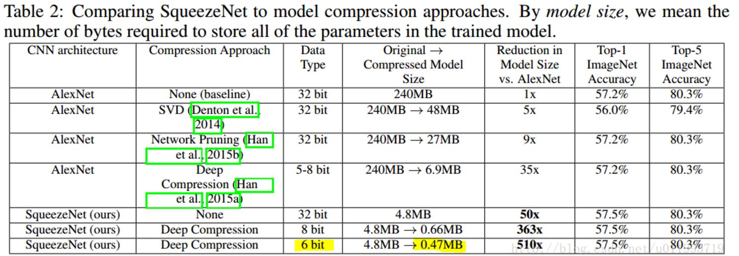 在这里可以看到,论文题目中提到的小于 0.5M,是采用了 Deep Compression 进行模型压缩之后的结果!!