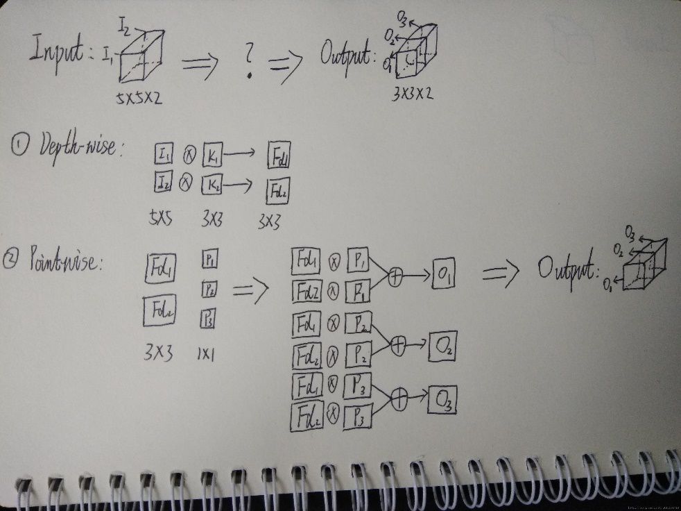 Depth-wise 过程如下图,可以看到 depth-wise convolution 得出的两个 feature map——fd1 和 fd2 分别只与 i1 和 i2「发生关系」,这就导致违背上面所承认的观点「输出的每一个 feature map 要包含输入层所有 feature map 的信息」,因而要引入 pointwise convolution。