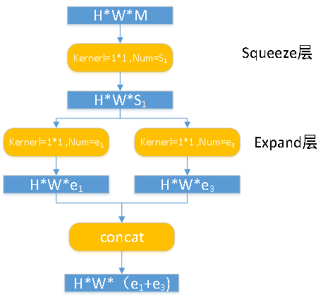 Fire module 输入的 feature map 为 H*W*M 的,输出的 feature map 为 H*M*(e1+e3),可以看到 feature map 的分辨率是不变的,变的仅是维数,也就是通道数,这一点和 VGG 的思想一致。