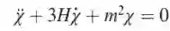 这是一个2阶的常微分方程,刻画的是带有阻力的弹簧的振动方程,其中带哈勃参数H的那一项表示阻尼。如果H很大,相当于阻尼很大,这时标量场(相当于弹簧)是振荡不起来的,因此不能产生暗物质。从前面介绍的拉格朗日量可以看出,如果场随着时间变化,导数就比较大,这就好比在一个湖面上,如果有波动,就容易产生水花;但如果湖面是静止的,即使湖面的水位很高、势能很大,也不会有水花。