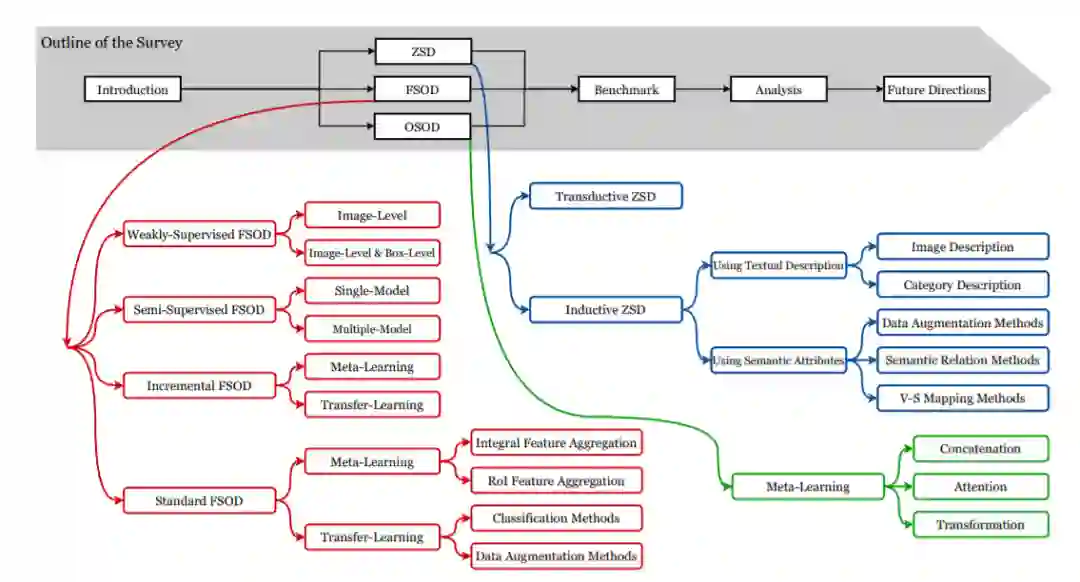 图1. 本次综述的概述。本文对低样本目标检测进行了全面的介绍,并将低样本目标检测分为单样本目标检测、少样本目标检测和零样本目标检测三个领域。图中还用三种颜色演示了这三个域的更细粒度的分类,后面的小节将详细讨论这些分类。然后总结了OSOD、FS和ZSD的基准,并比较分析了不同LSOD方法在这些基准上的性能。最后对LSOD的发展方向进行了展望。