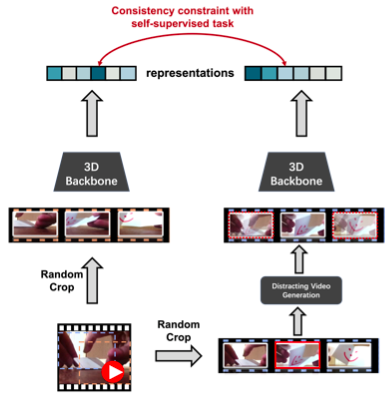 自监督学习通过从数据本身来获取监督信号,在视频表征学习领域展现出了巨大潜力。由于一些主流的方法容易受到背景信息的欺骗和影响,为了减轻模型对背景信息的依赖,我们提出通过添加背景来去除背景影响。具体而言,给定一个视频,我们从中随机选择一个静态帧,并将其添加到其它的每一帧中,以构建一个分散注意力的视频样本,然后要求模型拉近 分散注意力的视频样本与原始视频样本之间的特征距离,如此使得模型能够更好地抵抗背景的影响,而更多地关注运动变化。我们的方法命名为背景消除(Background Erasing,BE)。值得注意的是,我们的方法可以便捷地添加到大多数SOTA方法中。BE在MoCo的基础上,对具有严重背景偏见的数据集UCF101和HMDB51,分别带来了16.4%和19.1%的提升,而对具有较小背景偏见的数据集Diving48数据集带来了14.5%的提升。
