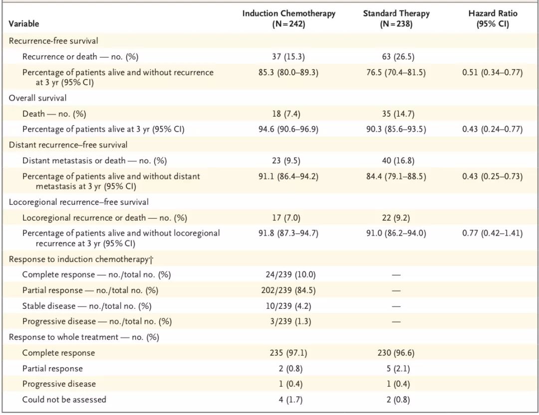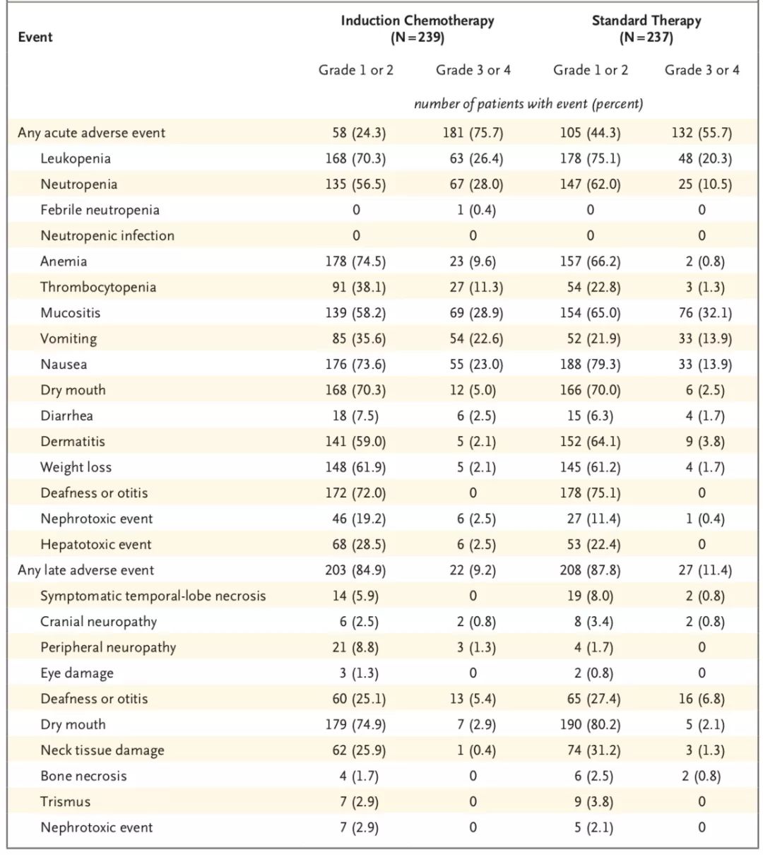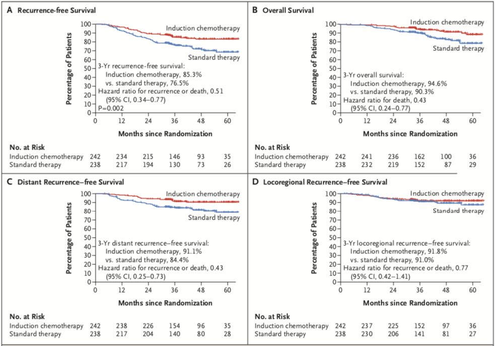 该项临床试验在全国12家中心一共招募了480例患者。研究的结果表明,在同步放化疗的基础上增加GP诱导化疗,结果可以将3年无瘤生存从76.5%提高到85.3%。同时总生存率也从90.3%提高到94.6%。并且GP诱导化疗方案相对安全,超过95%的病人可以顺利完成3疗程诱导化疗。虽然增加了一些急性毒性反应比如中性粒细胞下降、血小板下降,但是这些毒性反应在临床上比较容易处理,而且该方案也没有明显增加病人的远期毒性反应。