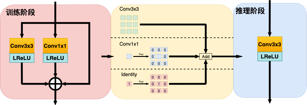 该流程在模型训练阶段,对每个 3x3 卷积增加并行的 1x1 卷积分支和恒等映射分支;而在模型实际推理阶段,则把对应的 1x1 卷积分支和恒等映射分支通过 padding 操作分别等价转换成特殊的 3x3 卷积,根据卷积的线形可加性,再将参数合并到主分支的 3x3 卷积里面。