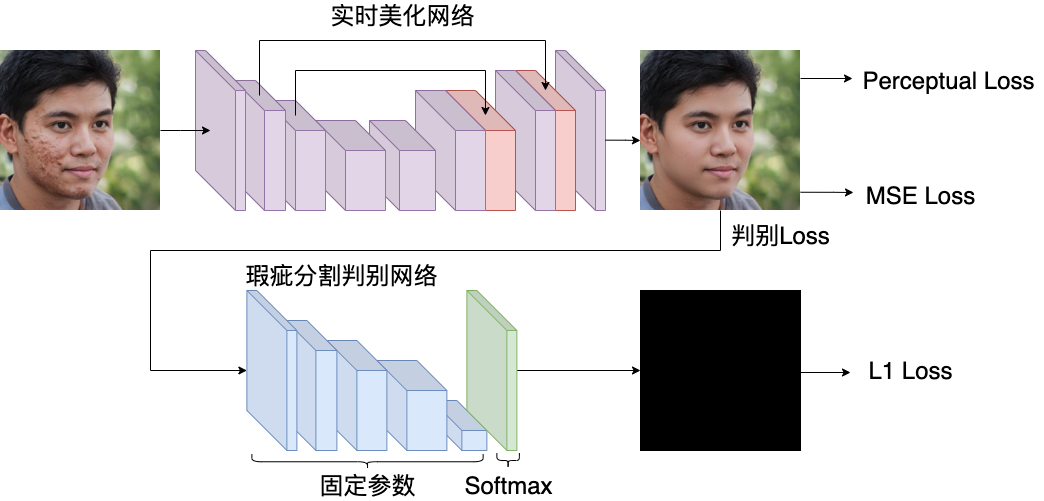 在训练实时美化网络时,固定判别网络的参数,将实时美化网络输出的结果作为判别网络的输入,同时用一张全“0”mask 作为监督,要求判别网络监督实时美化网络不能生成有瑕疵区域的结果,从而达到提升美化效果的目的。
