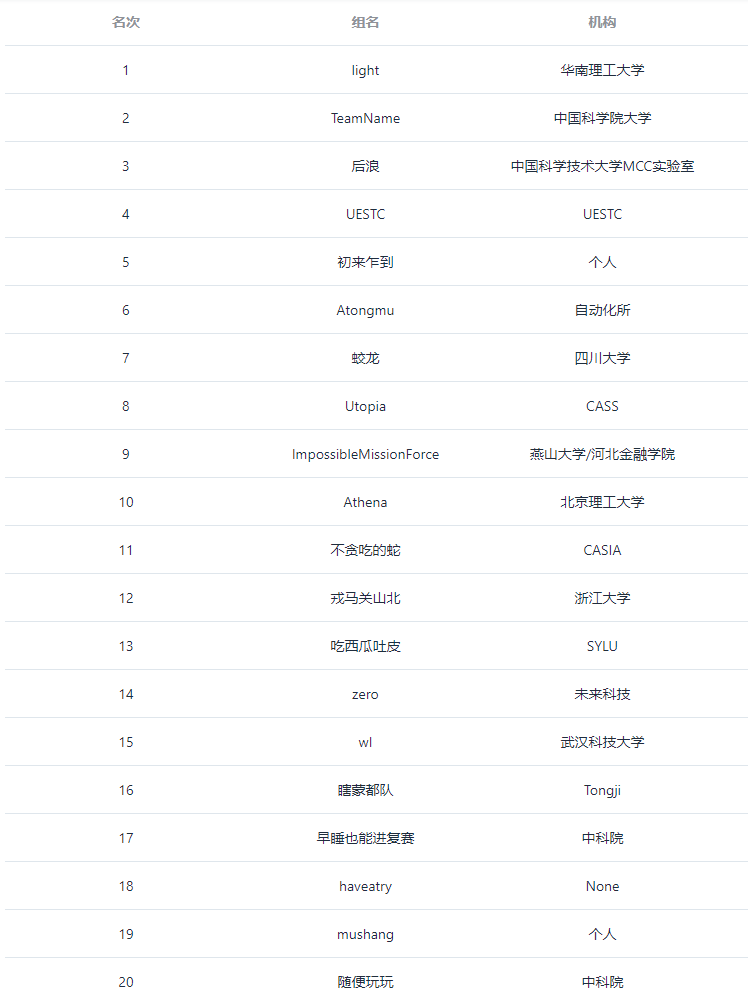 RLChina 智能体挑战赛 - 辛丑年秋赛季“贪吃蛇 3v3”比赛已于2021年10月23日圆满结束。本次比赛共有66支队伍参赛,获得前三名的队伍分别来自华南理工大学、中国科学院大学、中国科学技术大学。20强队伍如下: