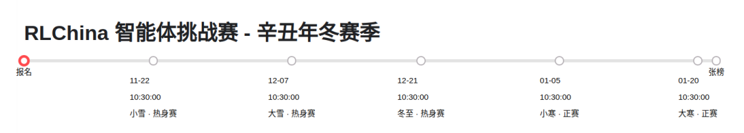 RLChina 智能体挑战赛 - 辛丑年冬赛季于 2021 年 11 月 8 日至 2022 年 1 月 20 日在中科院自动化所“及第”平台举行,赛程包括三次热身赛和两次正赛,五场比赛的日期分别是中国农历节气小雪、大雪、冬至、小寒、大寒。