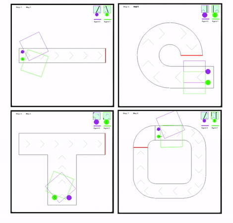 ❖ 当有一个智能体到达终点(红线)或环境达到最大步数500步时环境结束,先冲过终点的一方获胜,若双方均未过线则平局;