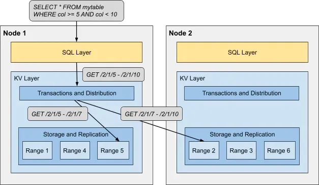 键值层维护一个事务性的、分布式的、复制的键值存储。这很拗口,所以让我把它分解一下。每一个键都是一个唯一的字符串,映射为任意值,就像在字典里一样。键值将这些键值对以排序的方式存储,以便快速查找。键值对也被分组为范围。每个范围包含全部键值对中连续的、不重叠的部分,按键排序。范围分布在可用的节点上,为了高可用性,至少要复制三次。在全有或全无事务中,可以添加、删除和更新键值对。下面有一个简化的示例,展示了如何将更高级的 SQL 语句转换为简单的 KV GET 调用: