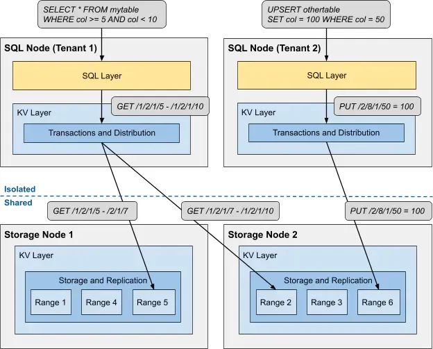 在看到这种架构后,你可能会想知道共享存储节点的安全性问题。为了保护租户数据,我们花费了大量时间设计和实施强有力的安全措施。每一个租户都会键值密钥空间的一个隔离的、受保护的部分。实现方法是在 SQL 层生成的每个密钥之前加上租户的唯一标识符。而不是生成一个像 /