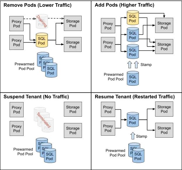 但是,还有一个问题有待解决。在未为租户分配 SQL pod 的情况下,租户如何连接集群?要回答这个问题,请记住每个无服务器集群都有一组代理 pod 正在运行。每一个由外部客户机发起的 SQL 连接都被代理 pod 截获,然后转发到分配给租户的 SQL pod。但是,如果代理发现当前没有为租户分配任何 SQL pod,它将触发与 Autoscaler 所使用的相同的 K8s 调整过程。从预热的 SQL pod 池中提取出一个新的 pod,并盖上戳,现在可以用于连接。整个恢复过程只需要几分之一秒,而我们正积极地努力使这个时间更短。