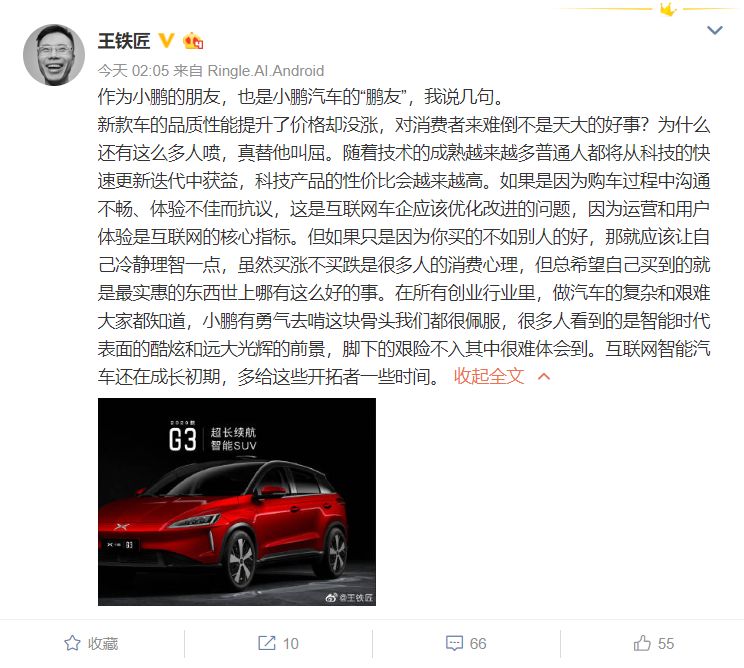 快播王欣发文声援小鹏汽车,称新款车的品质性能提升了价格却没涨,对消费者来说难道不是天大的好事?为什么还有这么多人喷,真替他叫屈。
