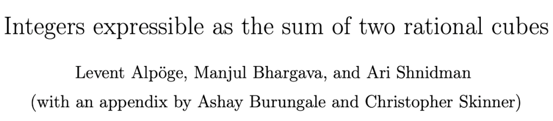 就在 10 月下旬发表的一篇论文中,三位数学家 Levent Alpöge、Manjul Bhargava 和 Ari Shnidman 证明了至少有 2/21(约 9.5%)和最多 5/6(约 83%)的整数可以写成两个分数的立方之和。值得一提的是,论文作者之一 Manjul Bhargava 在 2014 年因其对椭圆曲线研究做出的贡献而获得菲尔兹奖。