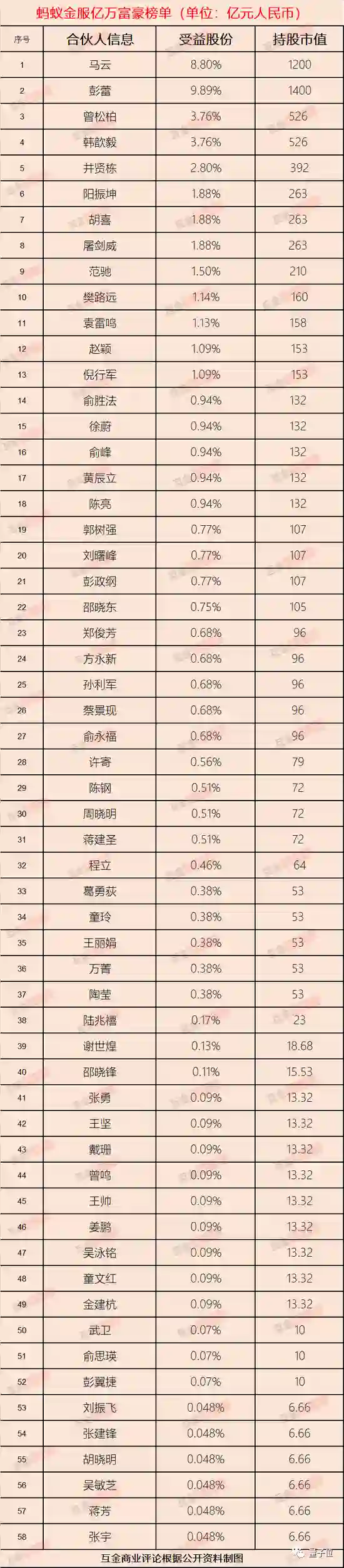 事实上,这58名亿万富翁中,持股量第一的竟不是马云,而是一手带起支付宝的彭蕾。