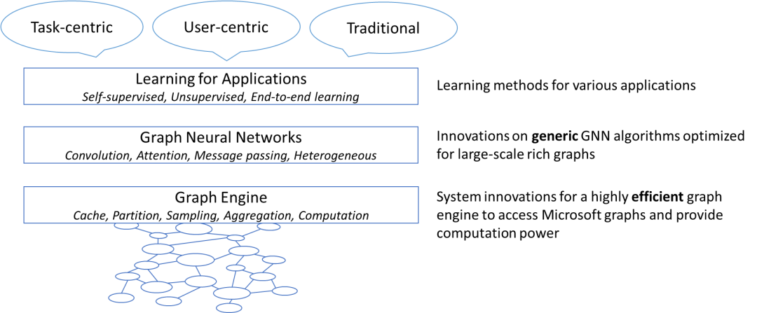 2019年底,在微软亚洲研究院院长周礼栋的协助下,白静团队主导并在微软公司内部成立了图神经网络工作组,为公司提供了一个从研究到产品的全局视野平台,以及和图学习相关的工具、算法,便于研究、产品、工程团队的跨部门协作、沟通和知识共享,从而提升图学习效率,促进系统和算法的研究创新。这一工作组的构建结束了各部门图深度学习研究和应用“各自为战”的局面,将“百花齐放”的算法统一在一个高效的平台上,不仅有利于激荡新思路,找到正确的研究方向,推动大规模的图学习应用和技术进步,还能将图学习算法上的创新成果快速迭代应用在相关的产品中。