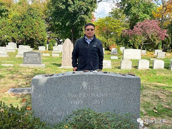 当我们在冯诺伊曼的墓碑前照相时,身后突然冒出一个美国人,问我:「你们在这干什么?」我说:「我们来向冯诺伊曼致敬。」他说:「我住在冯诺伊曼家。」我惊奇地问:「你是他儿子?」他说:「不是。我爸爸在我六岁时买了冯诺伊曼的房子。我在那个房子里住了66年。」