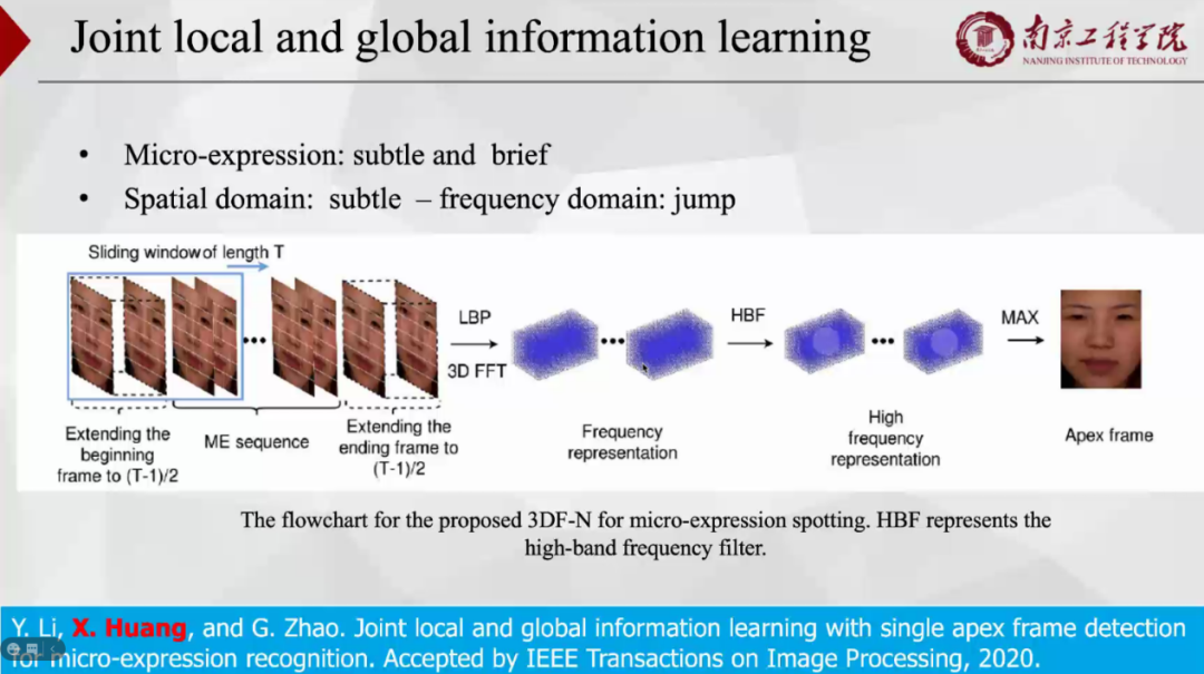 其次,黄晓华教授介绍了他们团队最新的工作:结合局部和全局信息学习的微表情识别方法。首先提出了基于3D频域的微表情峰值帧检测方法,提升了峰值帧检测的准确率。