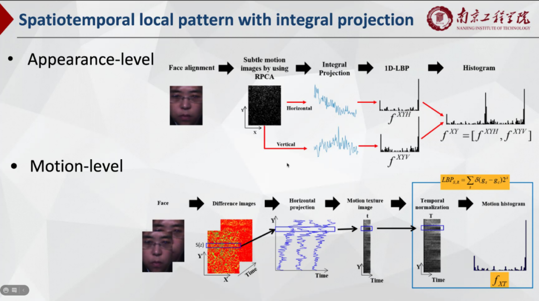 再者,由于LBP-TOP提取的是图像的纹理特征,黄教授提出了利用投影积分的方法加入人脸几何信息,通过从纹理特征和动作特征两个层面进行特征提取,从而把LBP和几何信息结合在一起,获得更加全面的微表情特征,有助于进行微表情识别。