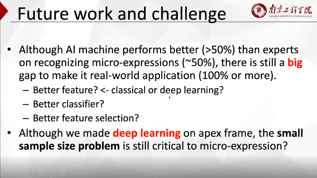 在讲座的最后,黄晓华教授展望了结合人工智能的微表情识别方法在未来的发展,从特征提取、分类器、以及微表情小样本问题等方面进行了分析。