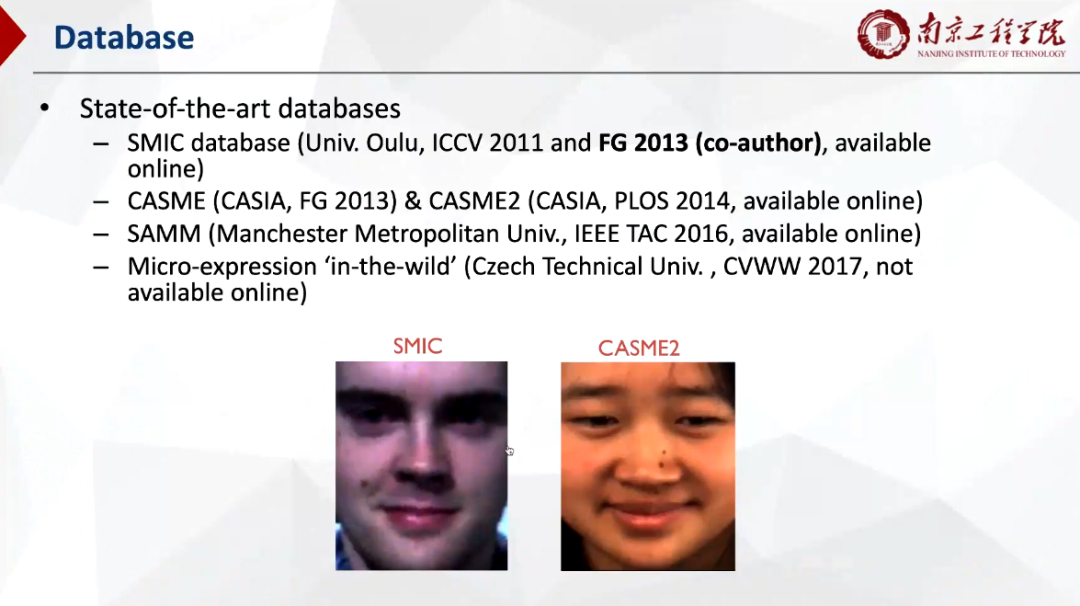 接下来黄教授介绍了微表情数据库的发展历史,包括黄教授之前参与创建的SMIC数据库、以及目前主流的微表情数据库。
